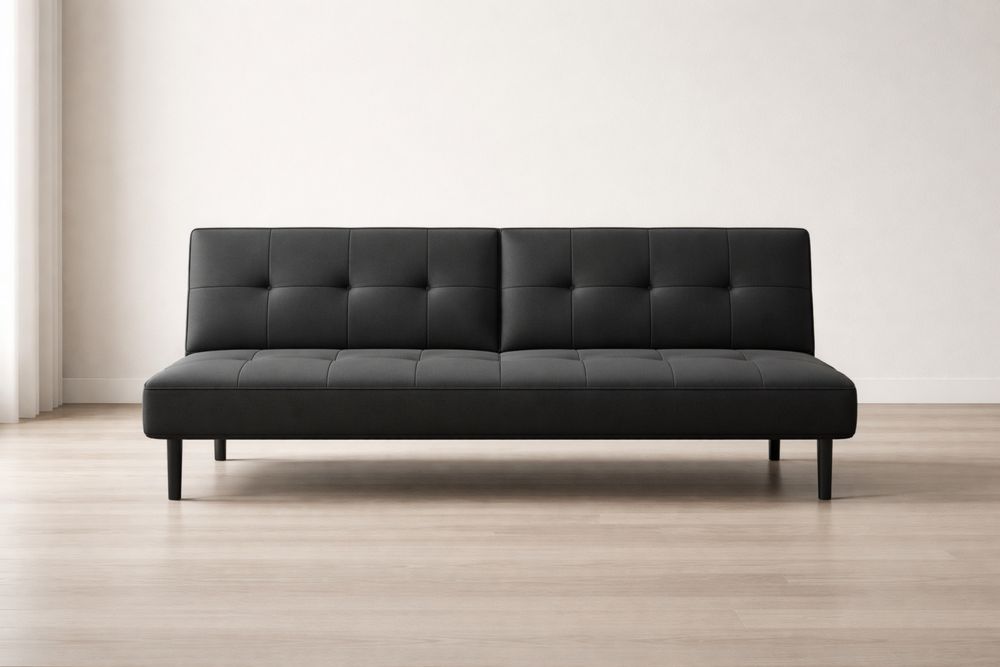 Canapé-lit en similicuir noir avec structure stable et mécanisme de conversion intégré. Revêtement facile d’entretien et lignes épurées adaptées à différents styles d’aménagement intérieur.